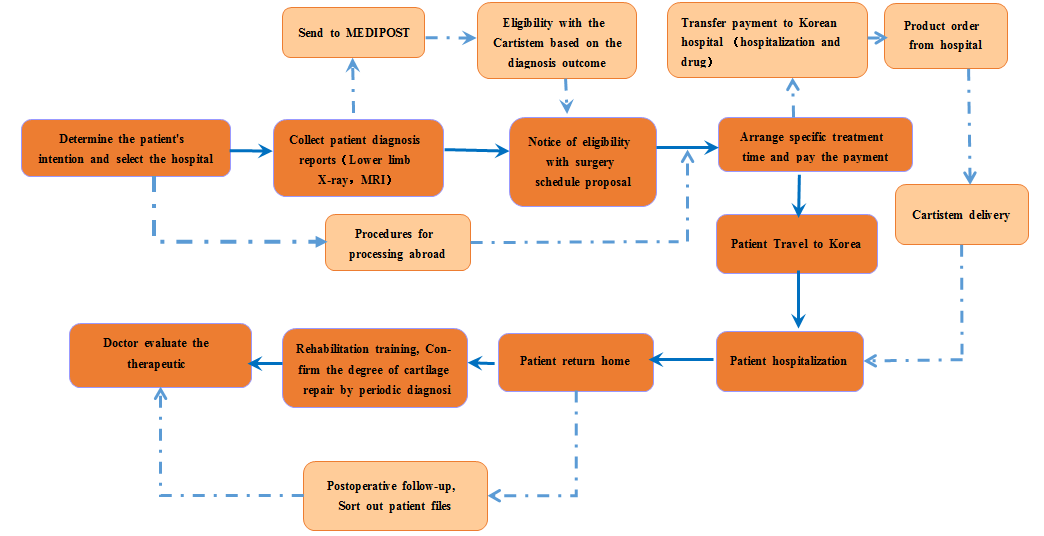 CARTISTEM treatment is available in Korea at more than 330 hospitals and clinics at the moment. The fastest option to make the product available to the OA patients in China is to bring the patients to Korea for treatment. Orlife already designed a full process of the medical tourism for Chinese patients seeking treatment. A company of Medipost Meditour was established in Korea as a fully owned subsidiary of Medipost for patient logistics and care when they arrive in Korea for the treatment. Alliance hospitals were selected in Korea who will be responsible for treatment of the Chinese patients. Medipost as a developer, product registration holder and manufacturer of CARITISTEM is at the center of the service, Medipost Meditour, an affiliate of Medipost, is registered and certified company by Korean government for foreign patient recruitment with insurance protection to cover any potential medical accident. Alliance hospitals in Korea were selected based on their product experience and excellence in medical expertise. Any dispute between patients and hospitals will be mediated and cared by Orlife in China and Medipost Meditour in Korea. Product liability and medical accident insurance are being covered by Medipost and Medipost Meditour.