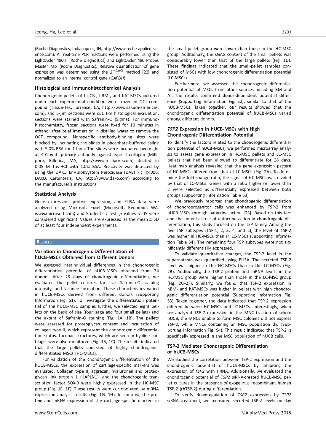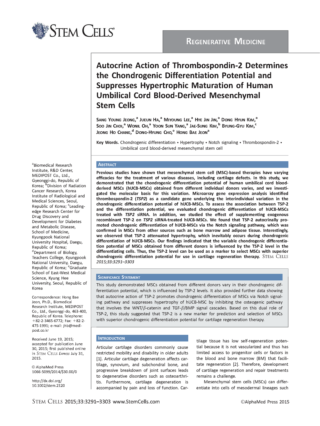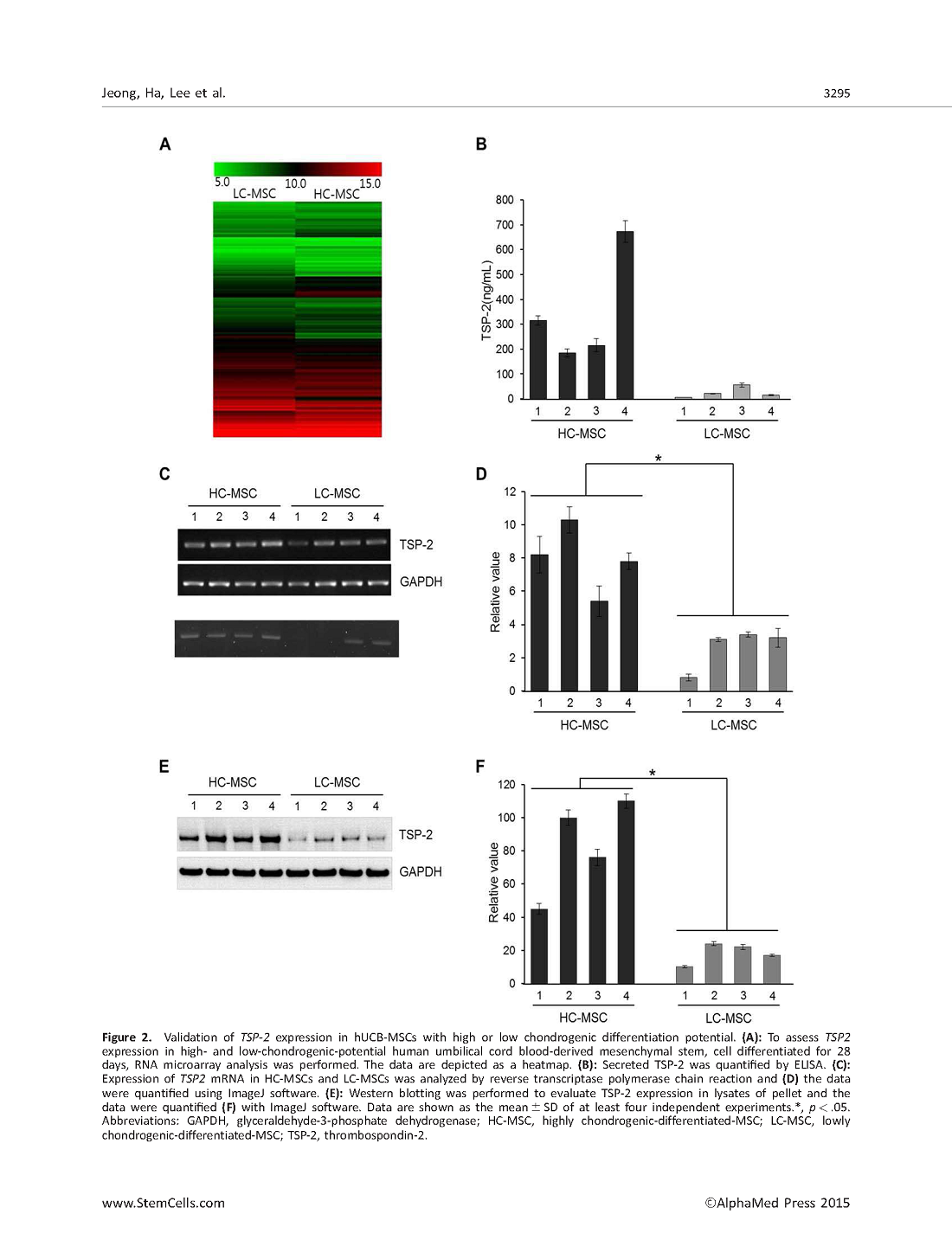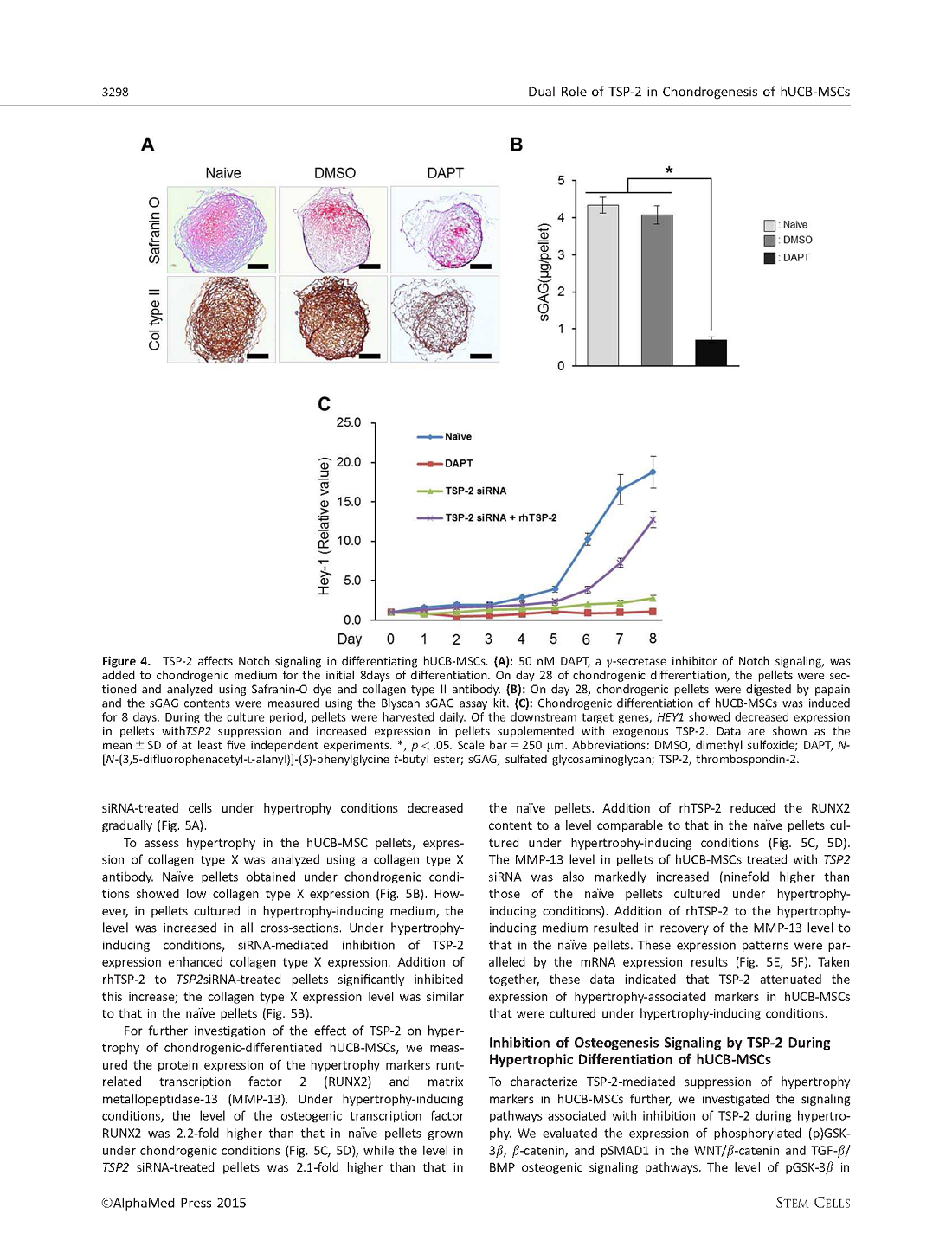 先前的研究已经证明:间充质干细胞可以有效地治疗多种疾病,包括软骨缺损。该研究中,来源于不同捐赠者的人脐带血间充质干细胞的软骨细胞分化潜能是不同的。微阵列基因表达分析发现,血小板反应蛋白-2(TSP-2)作为评价脐血间充质干细胞成软骨细胞分化潜能个体差异的候选基因。为了评估TSP-2和分化潜能之间的联系,我们评估例了TSP2 siRNA处理的脐血间充质干细胞向软骨细胞分化的潜能。此外,我们研究了补充外源性重组TSP-2对TSP2 siRNA治疗脐血间充质干细胞的影响。我们发现, TSP-2的旁分泌通过Notch信号通路促进脐血间充质干细胞向软骨分化,该通路已经被其他来源间充质干细胞证实,如骨髓和脂肪间充质干细胞。有趣的是,研究还发现TSP-2不可避免的出现了脐血间充质干细胞向软骨分化过程中的衰减肥大。我们的研究结果表明,不同捐赠者骨髓间充质干细胞向软骨的分化潜能受到分化细胞TSP-2水平影响。因此,TSP-2水平可以作为具有优越成软骨细胞分化潜能的间充质干细胞用于软骨再生疗法一个标记物。