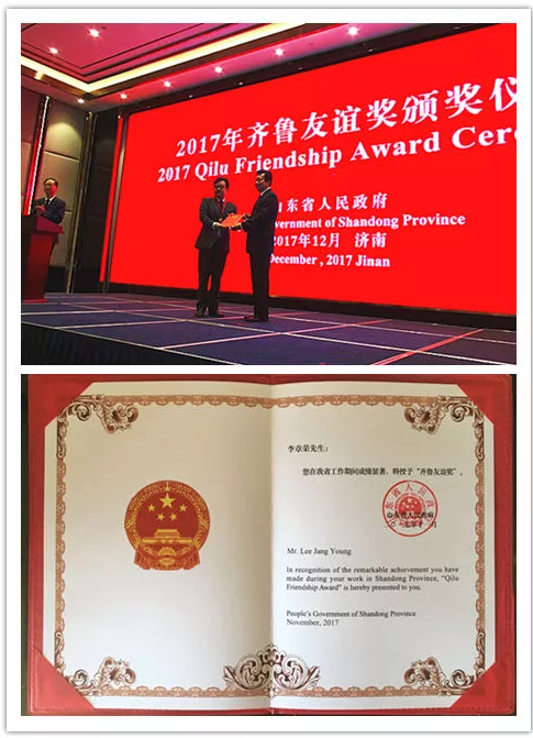 李章荣博士荣获2017年山东省政府“齐鲁友谊奖”
