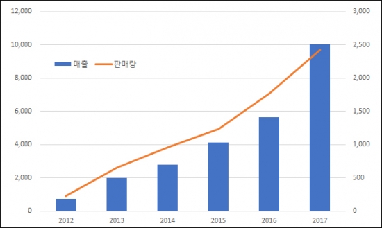 CARTISTEM自开始销售第一年取得7亿元(韩币)的销售额后一直呈上升趋势。 2016年达到56亿元(韩币)的纪录后,2017年到达了100亿元(韩币)的高地。CARTISTEM的销售量也从2012年的228件上升到去年的2428件,保持着高速增长。截止到去年,CARTISTEM的累计销售量达到7283件。