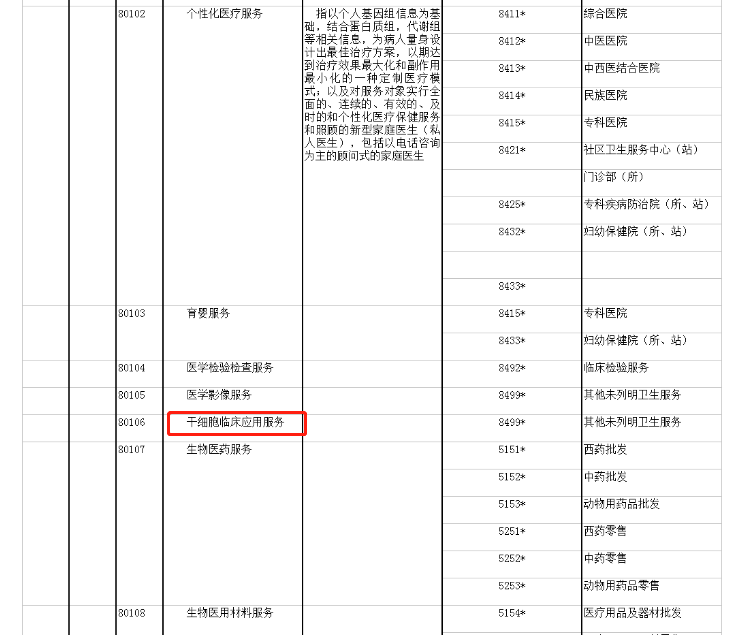 分类中明确将干细胞临床应用服务列为现代医疗服务,分类代码080106、国民经济行业代码8499。