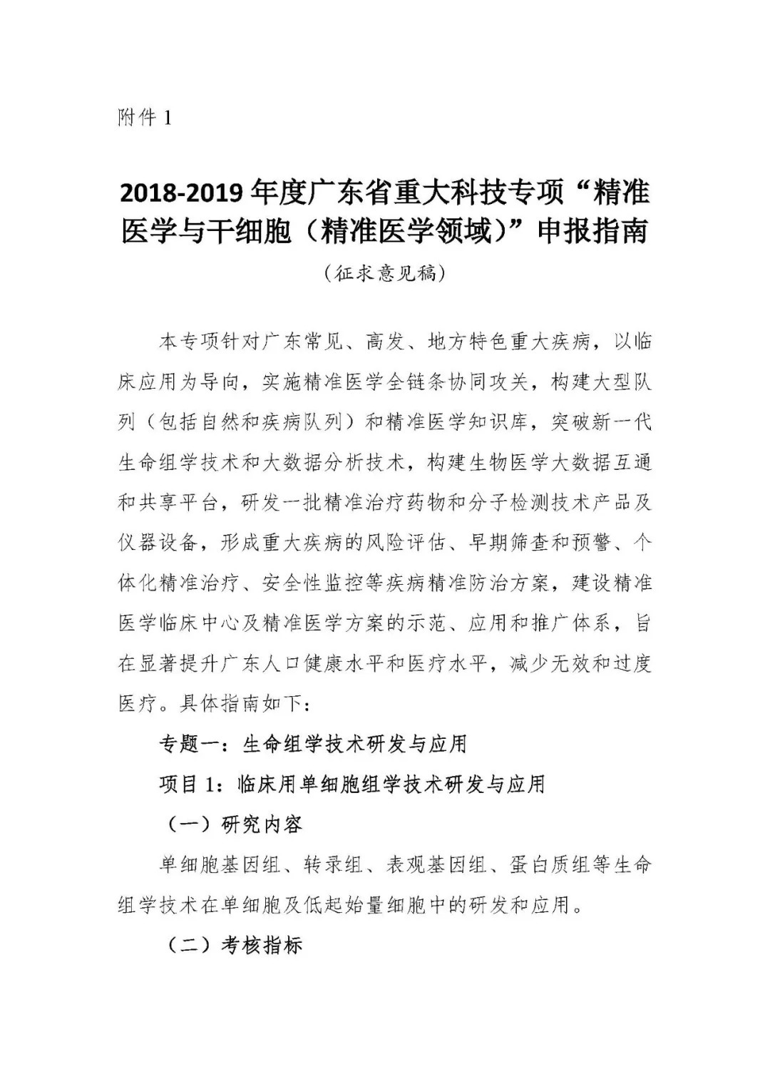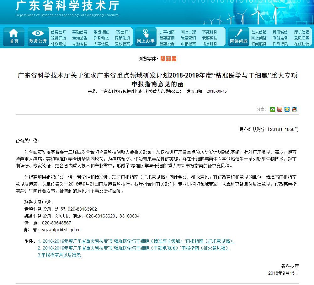 2018年9月15日,广东省科学技术厅正式发布了《关于征求广东省重点领域研发计划2018-2019年度“精准医学与干细胞”重大专项申报指南意见的函 》。