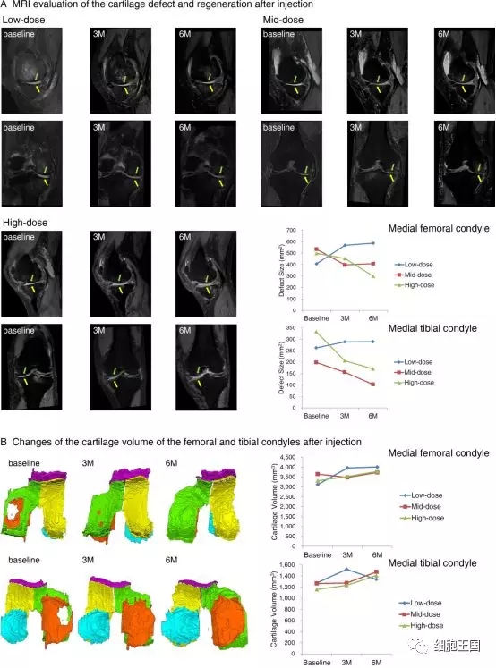 (b) :高剂量组注射脂肪间充质干细胞(AD MSC)后6个月内股骨内侧髁(上排绿色;右膝从上部观察)和胫骨内侧髁(下排橙色;右膝从下部观察)关节软骨体积的变化。高剂量组股骨内侧(右上图)和胫骨髁部(右下图)关节软骨体积显著增加。