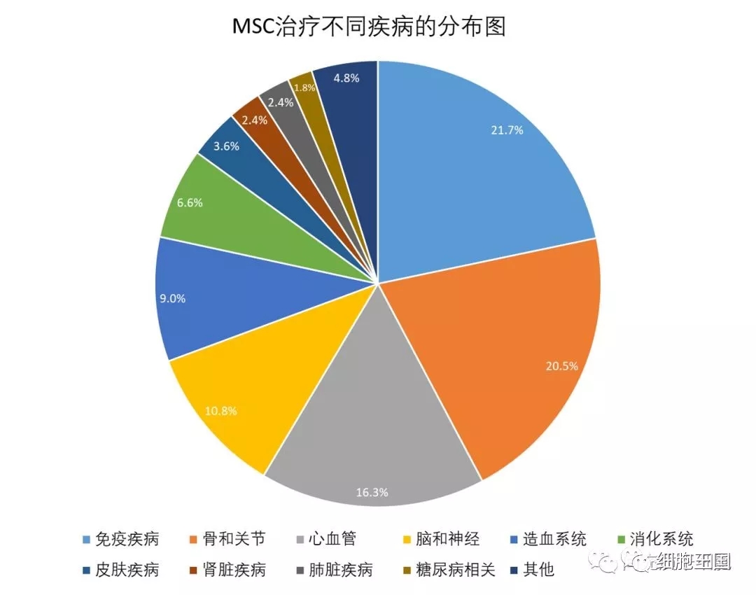 MSC临床研究的适应症的选择,遵从MSC的功能特性,主要是免疫抑制(消炎)和促进血管组织再生,所以免疫性疾病的应用最为广泛。其次为骨和关节方面的疾病、心血管疾病、脑和神经疾病等(见下图)。